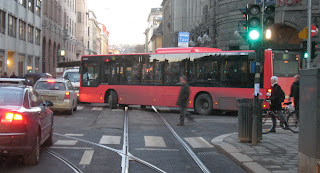 Det er egentlig ganske sjelden at det er buss eller trikk som står i veien på denne måten, som oftest er det personbiler som helt plutselig og uten skyld (nåvel) er kommet i skade (nåvel igjen) for å sperre kollektivfeltet, der de kommer fra en sidegate og skal inn i et felt som allerede er fullt av biler. Så fort og lett som floken løste seg for en ukes tid siden bare en MC-politimann viste seg frem med litt blinking med blålys, er det ikke skygge av tvil om at folk VET hva de driver med når de gjør slikt, de VET at de sperrer hele byen. De bare driter i det.